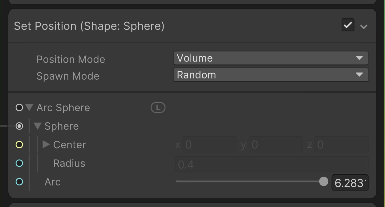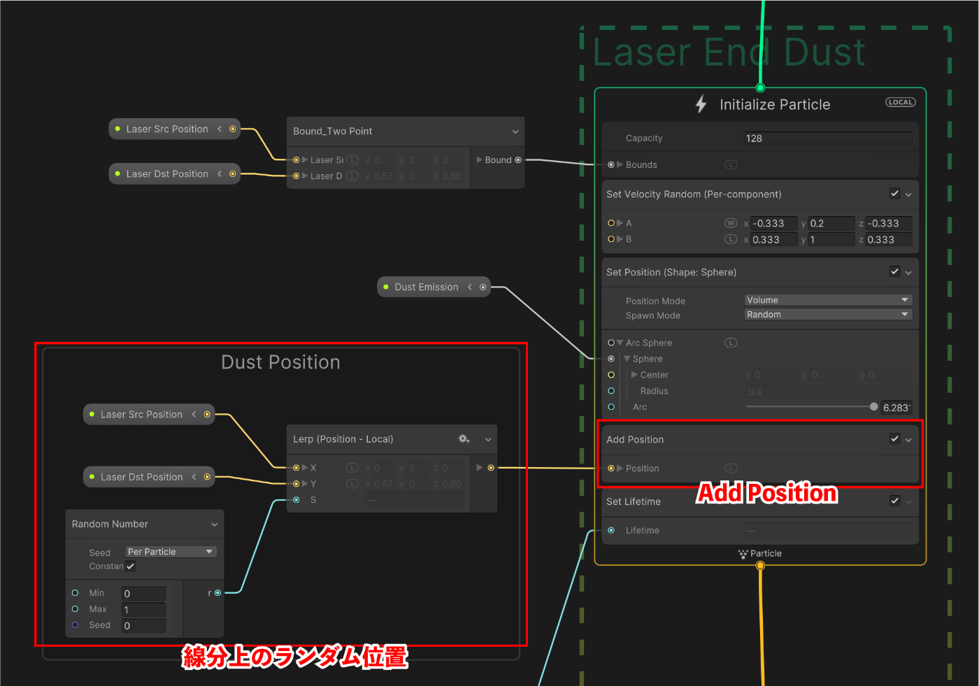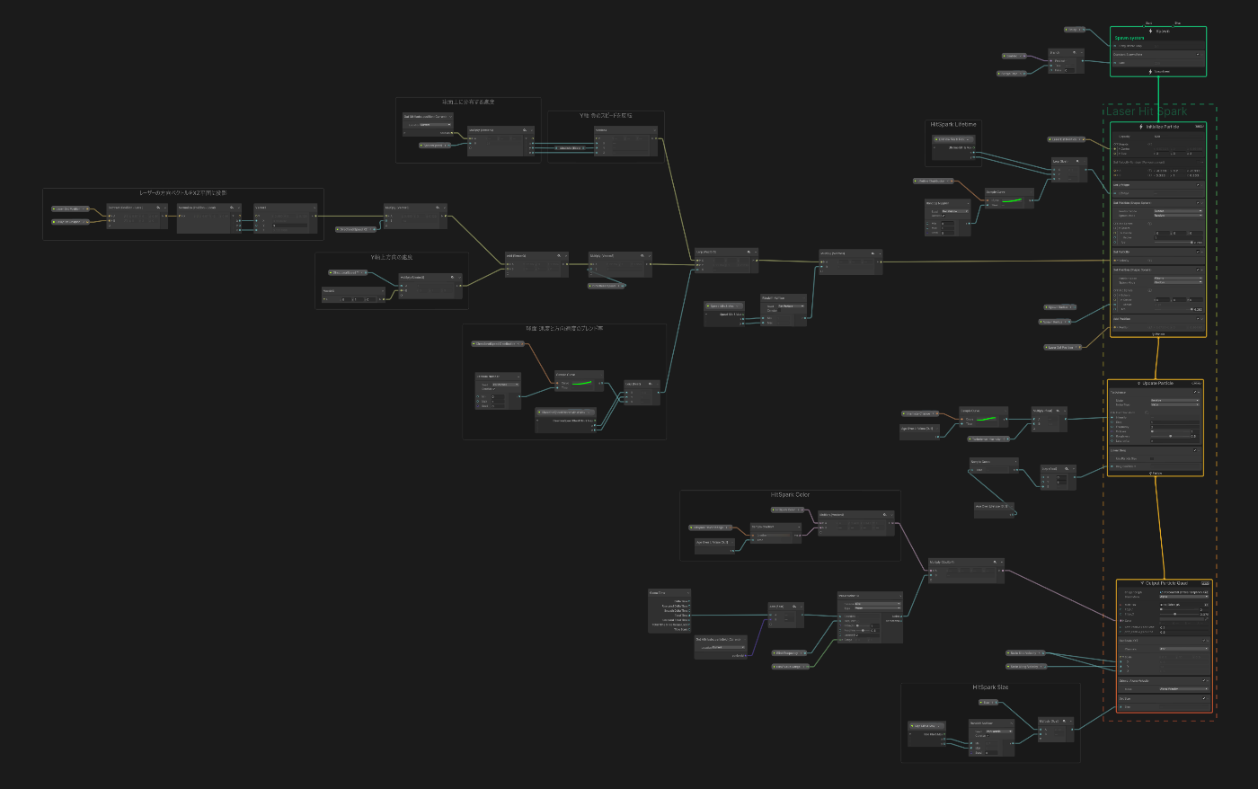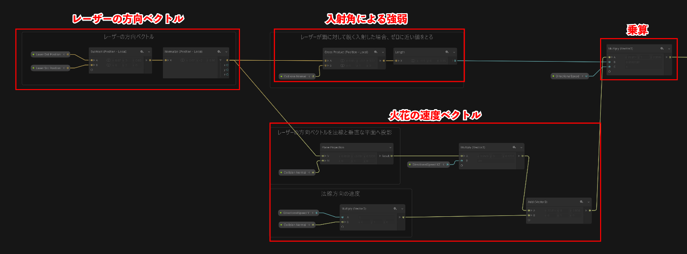 VFXGraphにレーザー終点の法線ベクトルを定義し、法線を元に火花の飛ぶ方向を計算します。