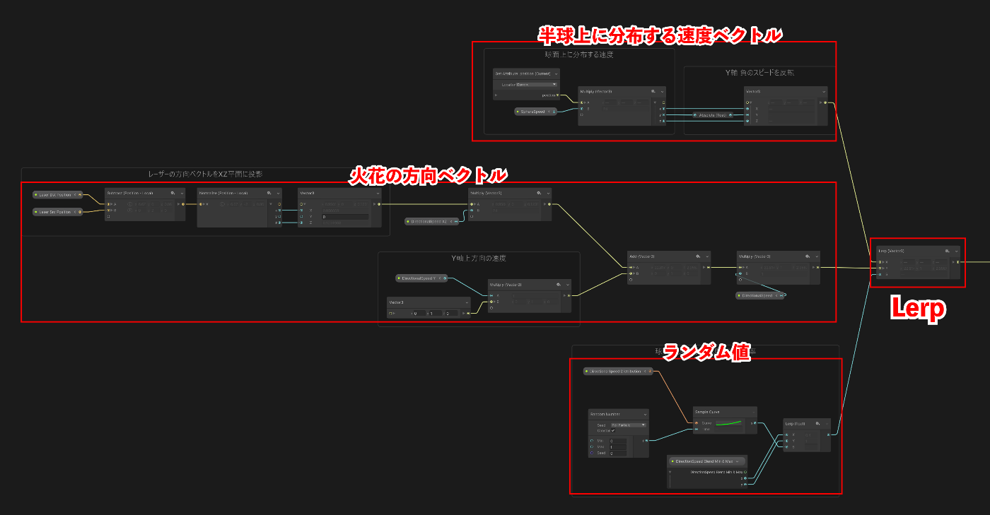 火花が飛ぶ方向を決定するノードは以下のようになります。