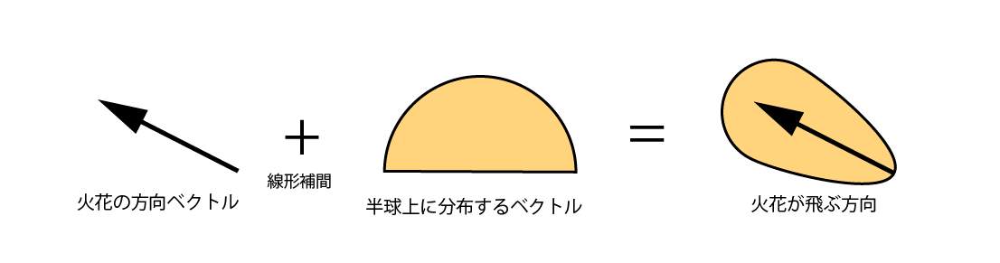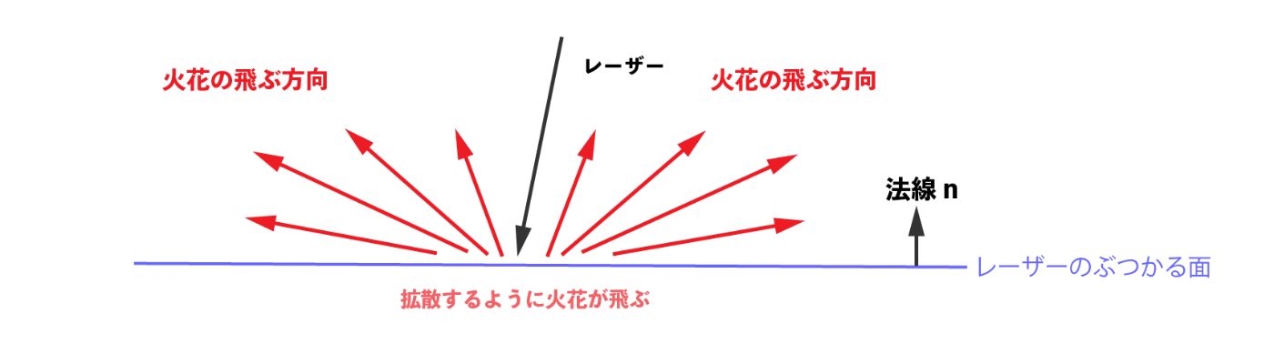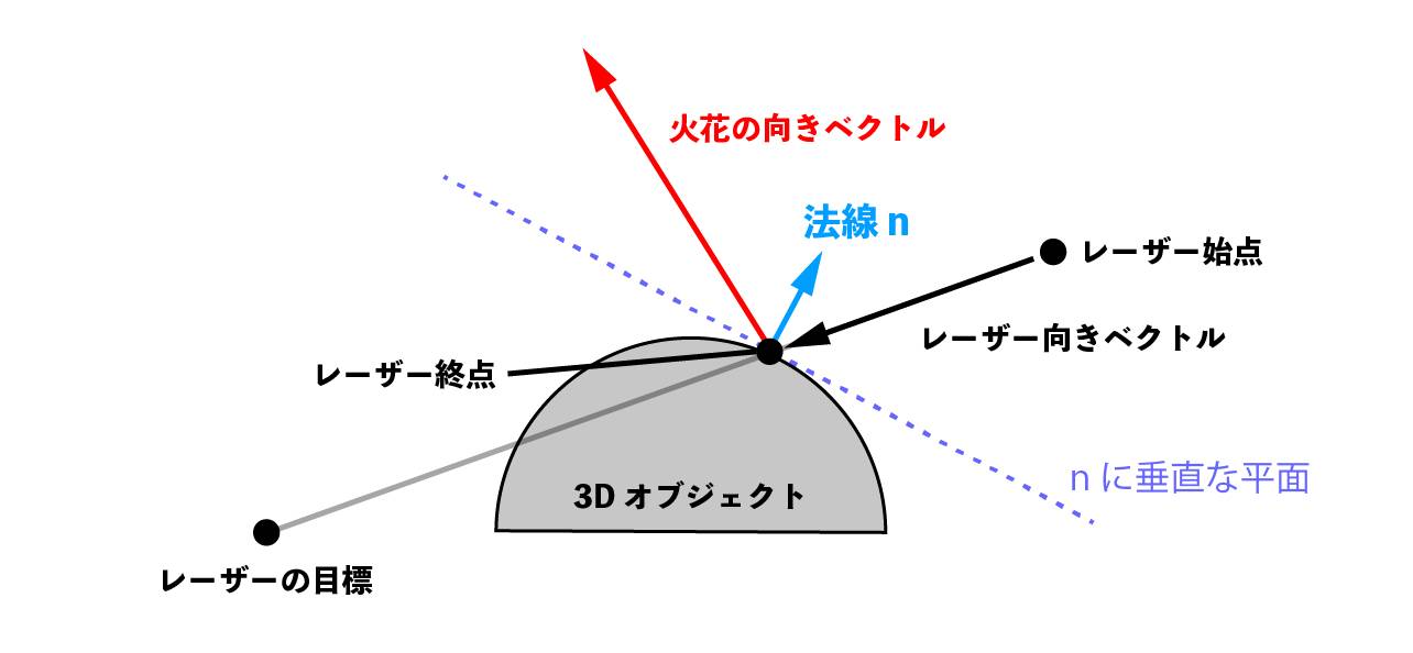 - 法線ベクトルnから火花の飛ぶ方向を計算