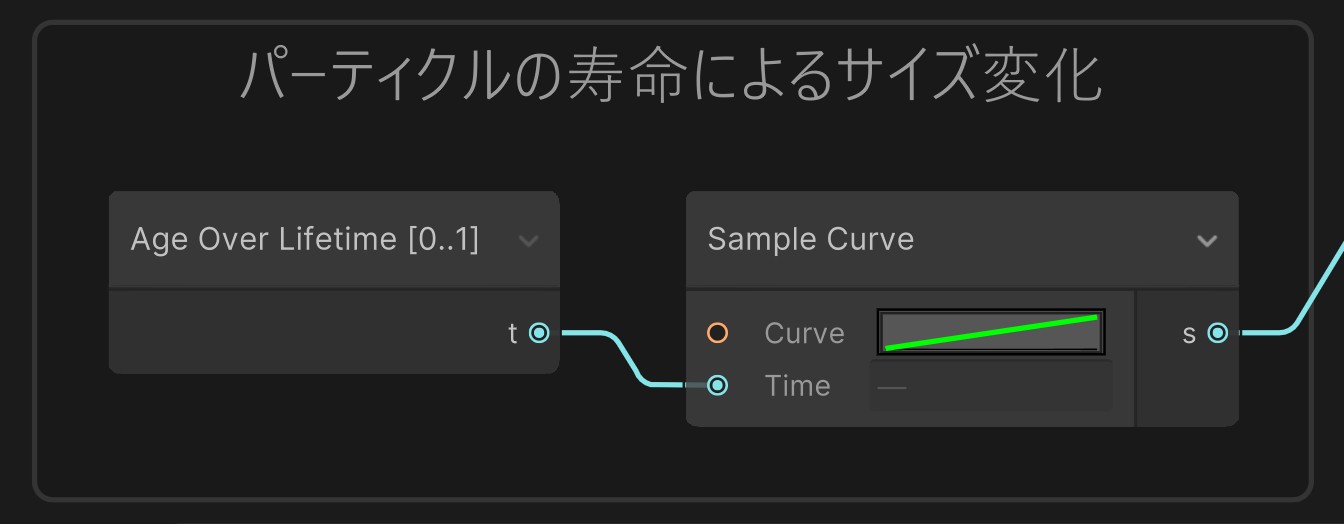 - パーティクル出現時に拡大、消滅時に縮小させる(Age over Lifetime、Sample Curveを利用)
