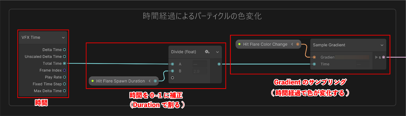 - 時間経過でパーティクルの色、サイズ、SpawnRate(パーティクル発生率)変化させる