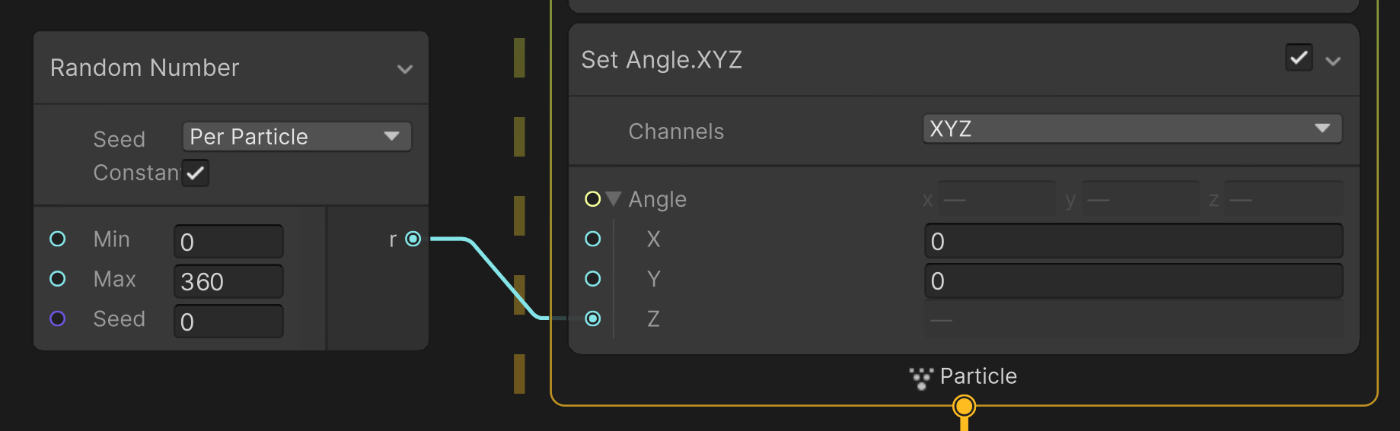 Set AngleにてZ回転量にランダムな数値を入れることにより、パーティクルをランダムに回転させることができます。