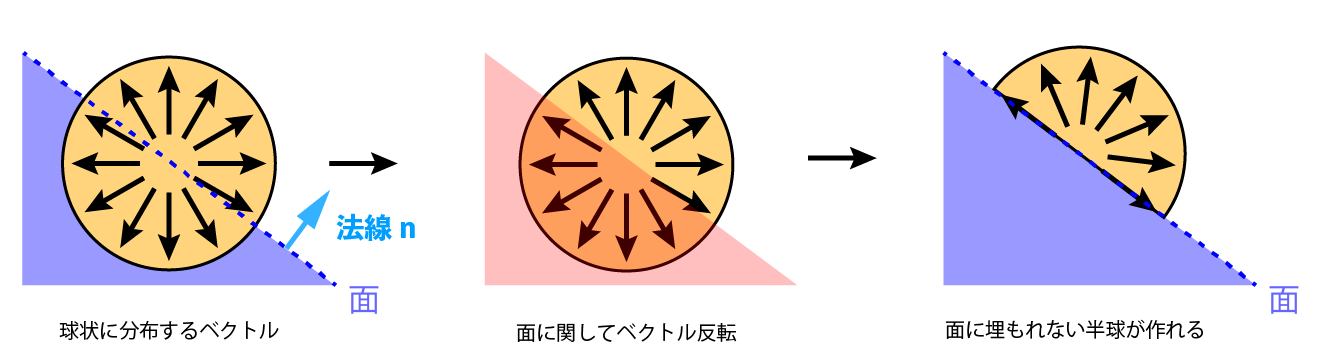 以下のように面の下に潜り込んでいるベクトルを面に関して反転させ、半球を作ります。