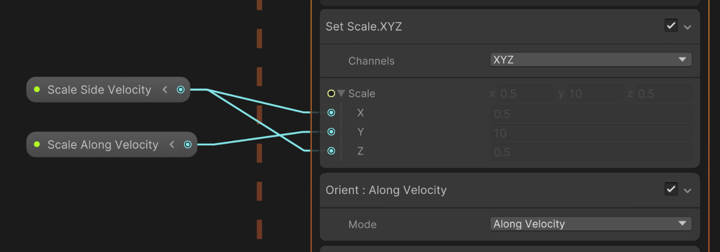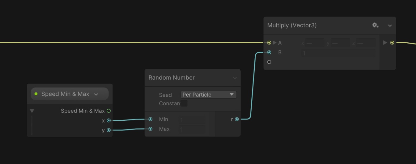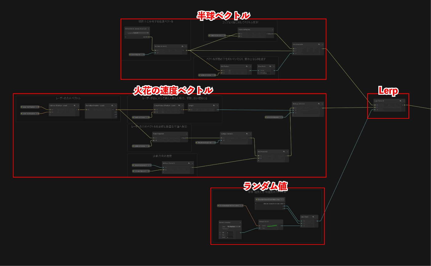 火花の速度ベクトルを求めるノードは以下になります。