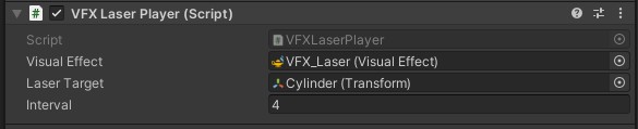 VFXLaserPlayerコンポーネント上では、レーザーのVisualEffectとレーザーが狙い撃ちする対象のオブジェクトを登録します。