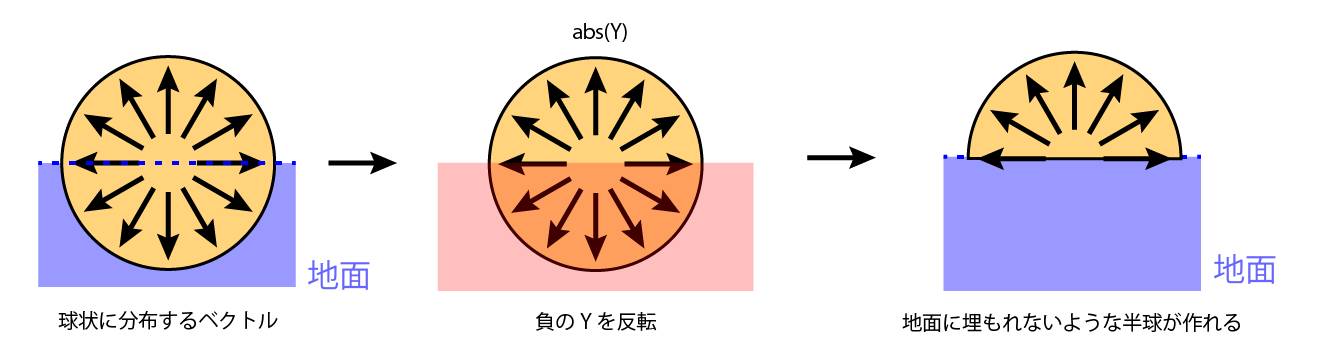 地面(XZ平面)に関して半球ベクトルを計算する際、球状に分布するベクトルのY座標にAbsを適用し、地面に埋もれないような半球を作っていました。