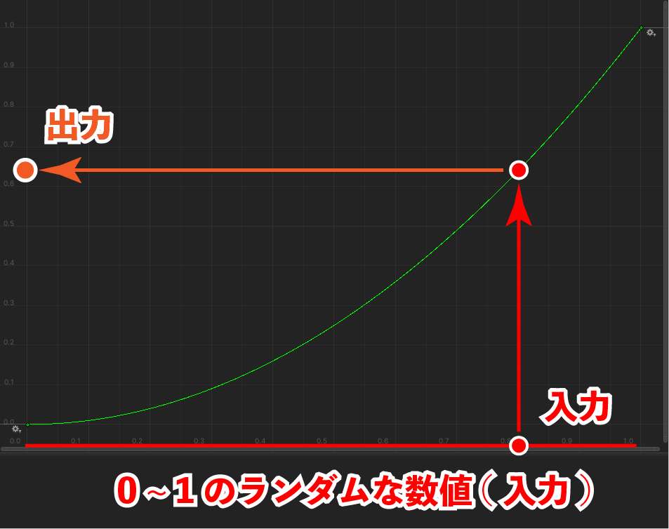 - Value Noise 1Dノード が出力するノイズ値(0~1)をPowerノードで補正(0~1)