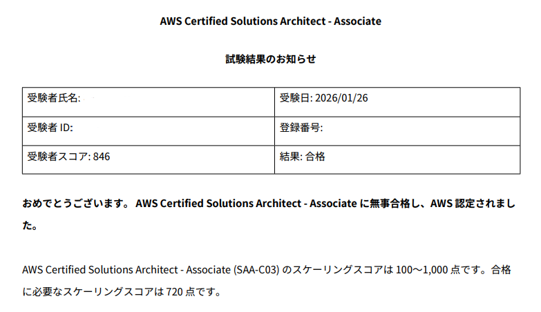 結果は 846 / 1000 点で合格でした。合格点が720点なのでまあまあ余裕がありました。