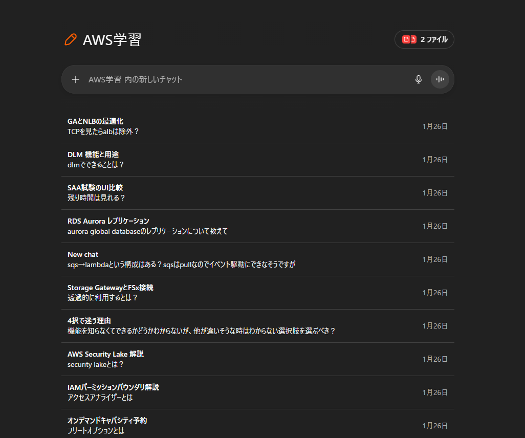 ChatGPTに「AWS学習」プロジェクトを作成し、ここでわからないことをひたすら聞き倒しました。はじめの頃は、普段使っているGCPとの対応関係も教えてもらって雰囲気を掴みました。