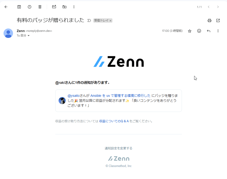 初動から2時間で(右上の)バッヂに気がついてブログを書いたが、zennからのメールは12時間以上過ぎてから届いた。
