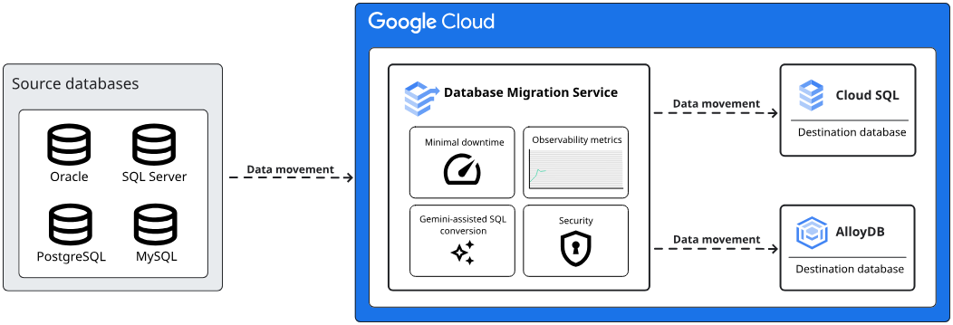 Database Migration Service(DMS)は、オンプレミスや他のクラウドで稼働している MySQL や PostgreSQL などのデータベースを、ダウンタイムを最小限に抑えながら Cloud SQL へと移行するためのフルマネージド サービスです。