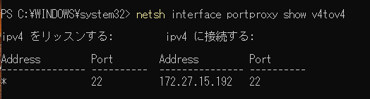 netsh interface portproxy add v4tov4 listenport=22 connectaddress=<IPアドレス> connectport=22