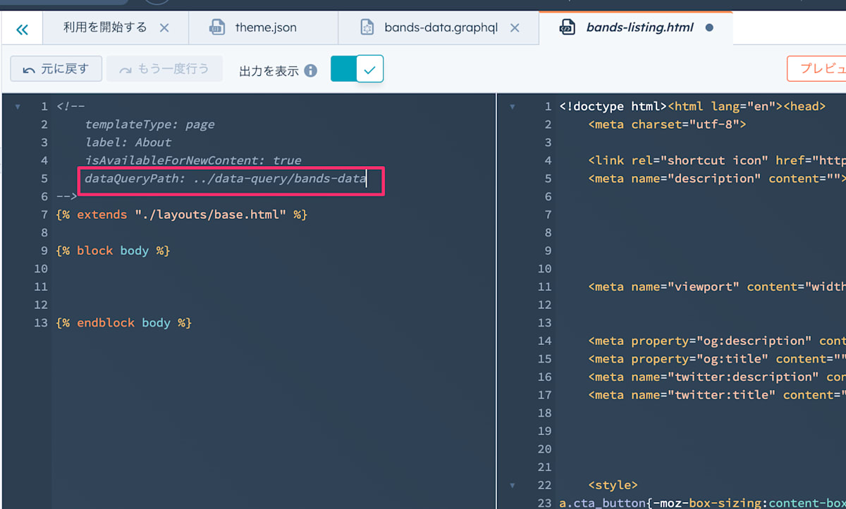 ステップ1で用意したクエリをステップ2で作ったテーマの中におきたいと思います。そのことで ステップ4のテンプレートから呼び出すことができるって感じですね