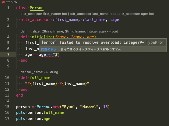 あとはRubyが書かれたファイルを開くだけで下記のように確認できるようになる。メソッドの引数や返り値の肩の提示、型の異なる変数同士の足し算などが実行前にエラーになっていることが確認できるはず。