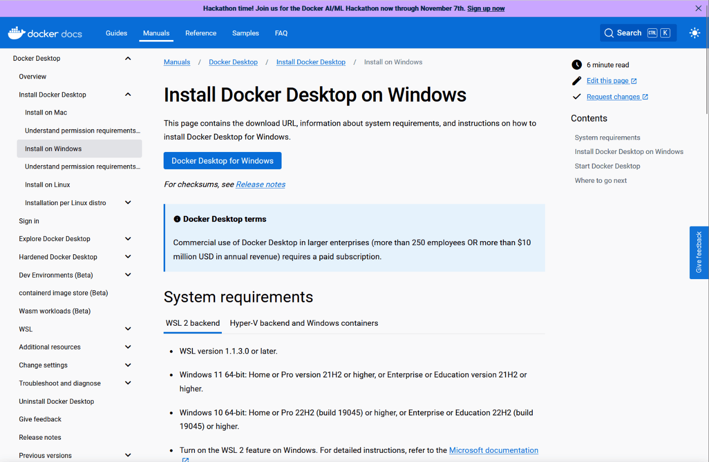 - 公式ページの「Docker Desktop Installer.exe」のリンクからインストーラをダウンロード。