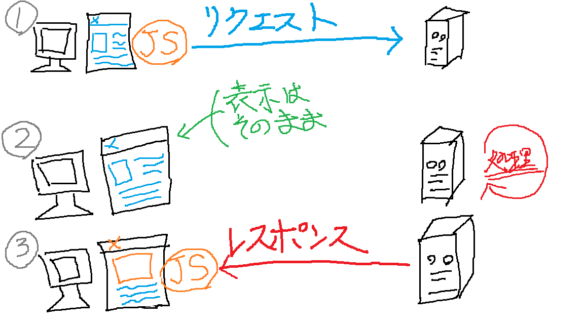 - ブラウザからのリクエストによる画面全体がロードされる → 後の操作で一部ページ更新が要求される → JavaScript がその部分に関して取得するリクエストをブラウザにお願い → ブラウザからリクエストを送信 → その部分をリロードせず描画