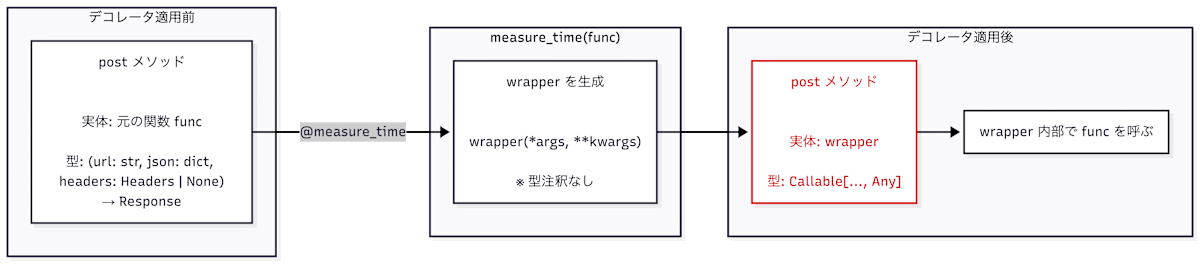 型チェッカーの視点から見ると @measure_time でデコレートされた後の post メソッドはもはや元の post メソッドではありません。wrapper 関数に置き換えられています。