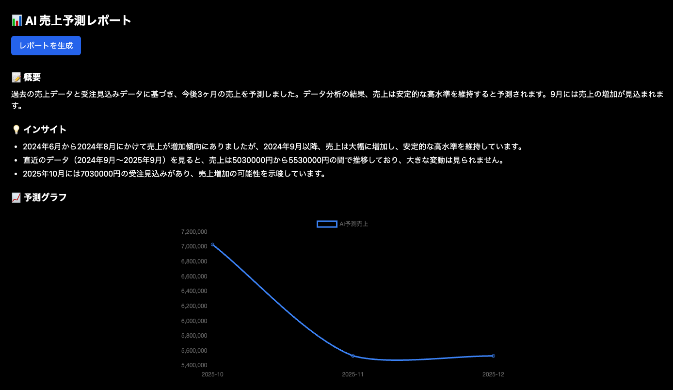 DB に蓄積された売上データを元に AI がレポートを生成する、というシンプルな機能です。