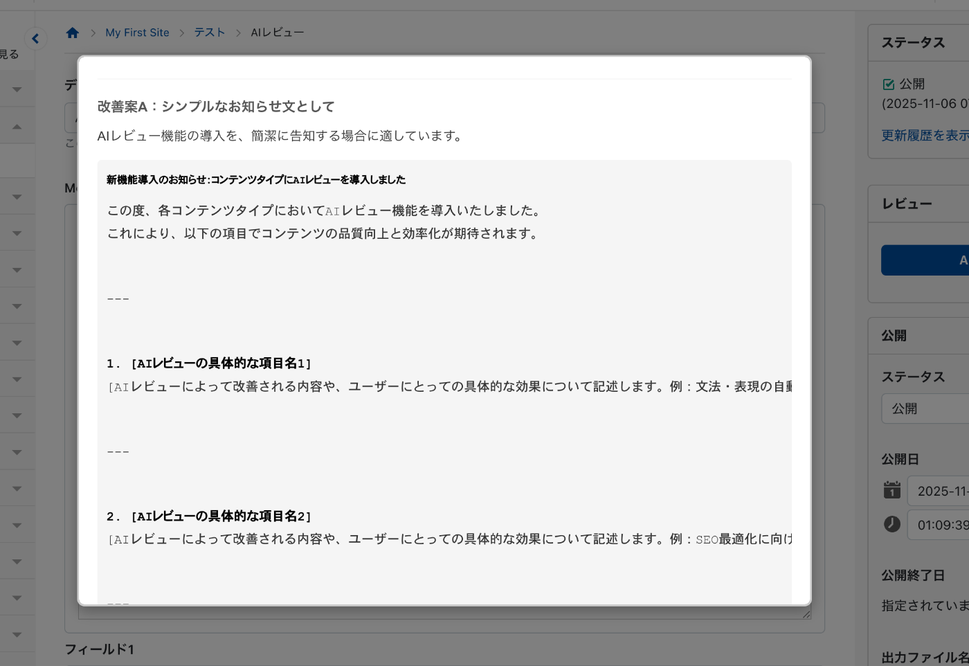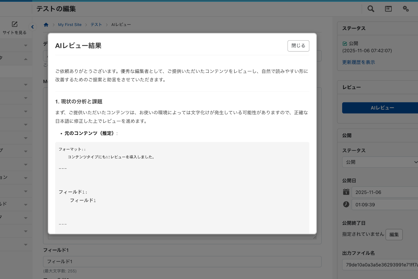 フィールドの情報テキストを元にAIにわたすプロンプト指示の情報として受け渡し、レビューを実施してくれます。