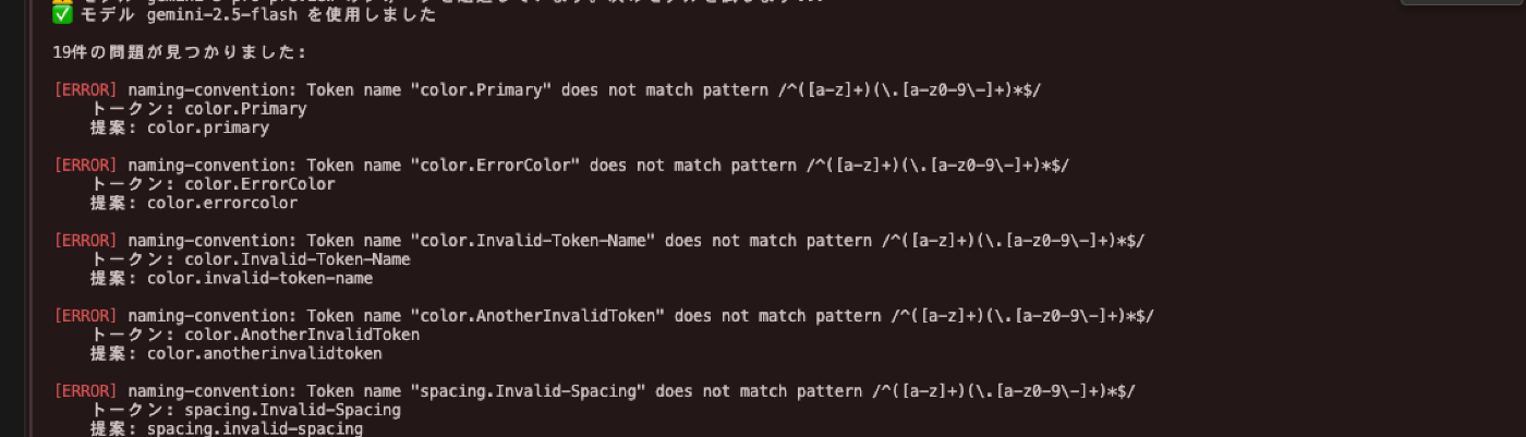 | ⚠️ 警告 | ai-semantic-naming | `color.anotherinvalidtoken` | 一貫性のない命名規則 (PascalCase) | 一貫した命名規則に従ってトークン名を変更してください。例えば、'color.anotherinvalidtoken'(フラットケース)または 'color.another-invalid-token'(ケバブケース)。 |
