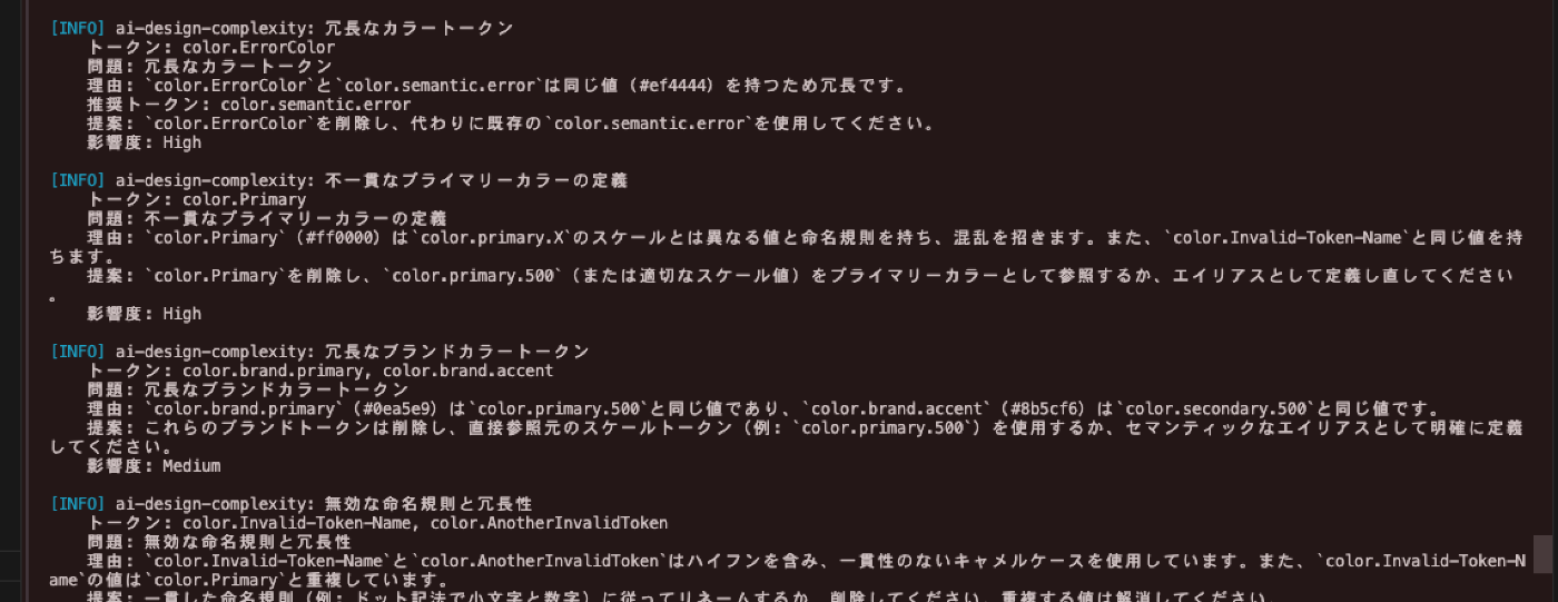 | ℹ️ 情報 | ai-design-complexity | `color.Invalid-Token-Name,` | 未定義または無効なトークン名の存在 | これらのトークンを削除するか、実際の用途に合わせて適切に命名し、デザインシステムに統合します。 |
