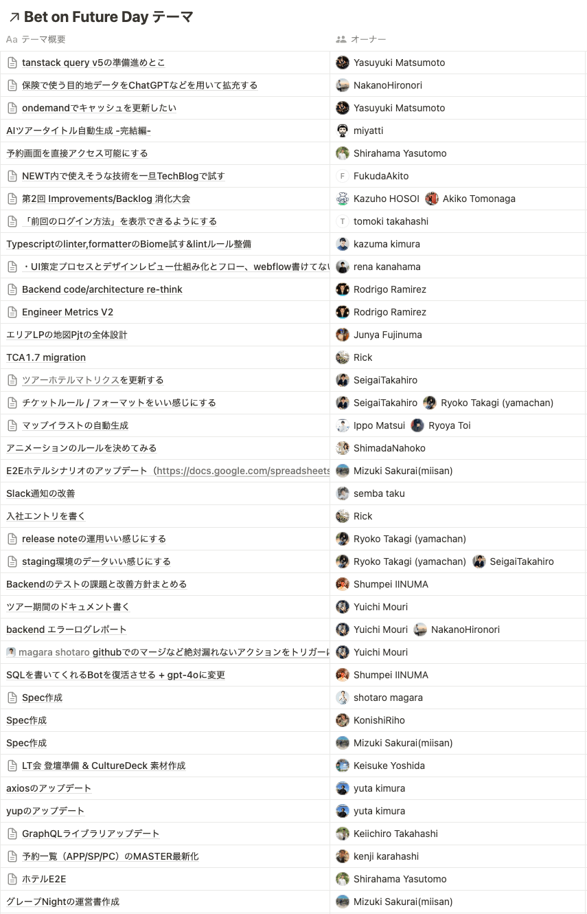 今回は、 「あたらしい旅行を、デザインする。」 という弊社のミッション実現と日々の業務効率化につながる取り組みとして、普段やれていないことをやり切る日としてテーマを設定しました。