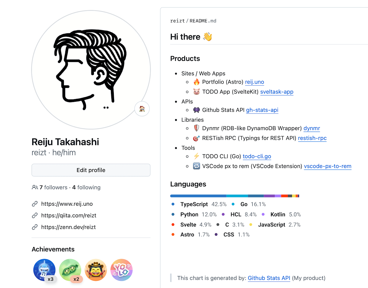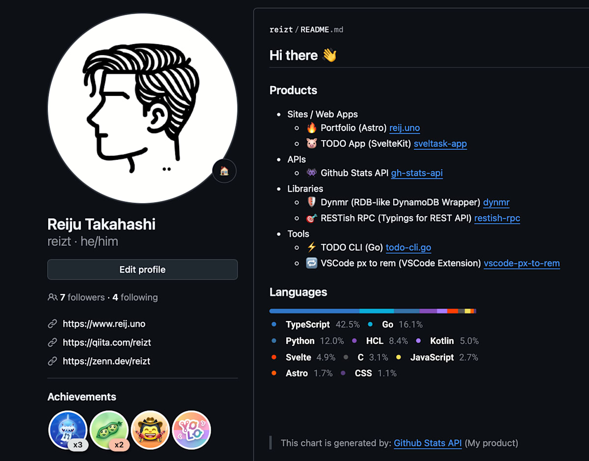 APIは公開しているので、 https://github.com/reizt/gh-stats-api のREADMEを読んで是非あなたのプロフィールにも表示してみてください!