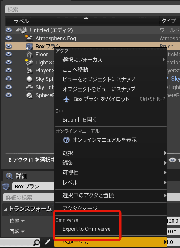 アウトライナーからExportしたいオブジェクトを選択→右クリック でExport to Omniverse
