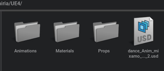 キャラモデルがProps、アニメーションシーケンスが Animations 以下に別のUSDとして出力され