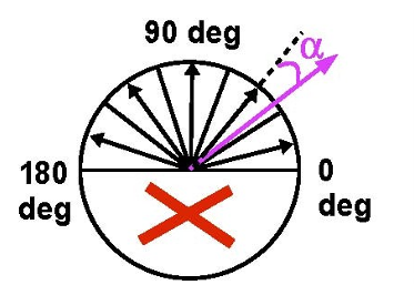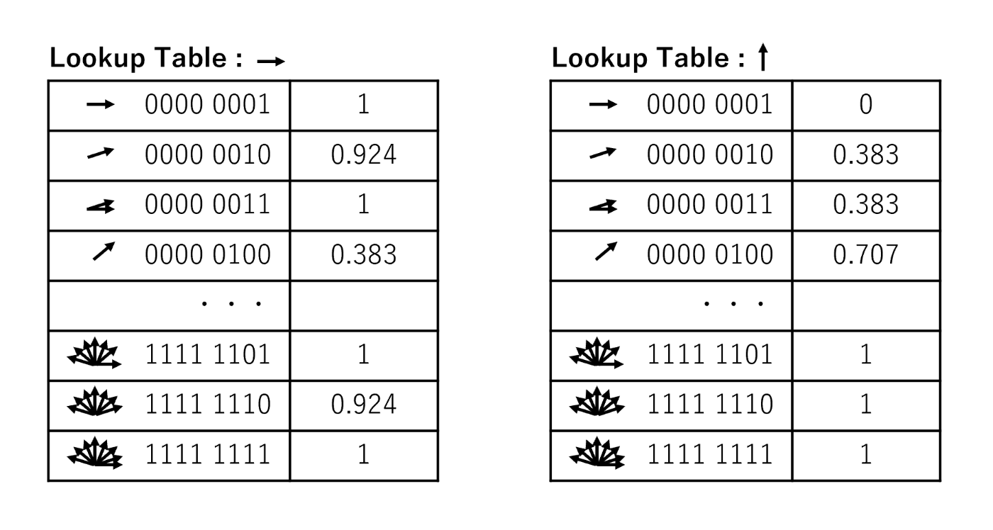 参考として、方位が0度(→)と90度(↑)ルックアップテーブルの例を以下に示す。方位が一致している場合はcos(0)で「1」となり、方位がズレる毎に類似度が低下していることが分かると思う。