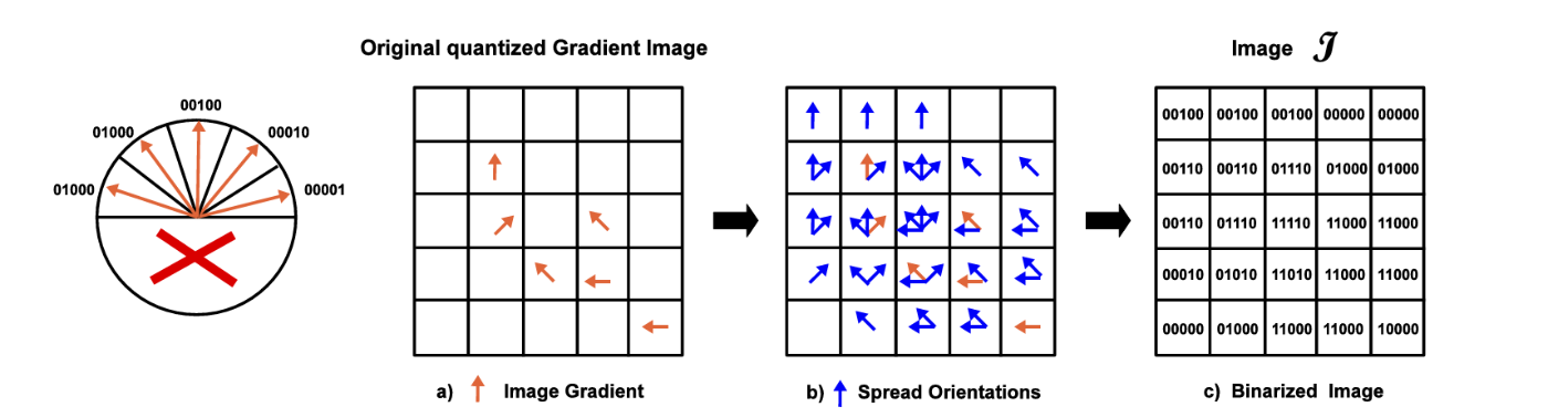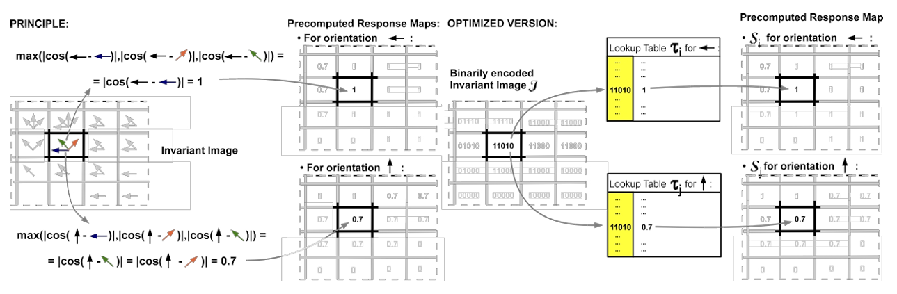 テンプレートをテスト画像位置に対して評価する度に(1)のコサインとmax演算子の評価を避けるために、各画像位置周辺の勾配の新しいバイナリ表現(J)を導入する。このバイナリ表現とルックアップテーブルテーブルを使用して、max演算の最大値を効率的に事前計算する。