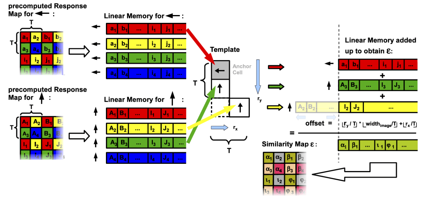 テンプレートの異なる方向(下記図の黒矢印)に対する線形メモリを、アンカー座標(探索基準座標)に対するテンプレートの相対位置 (Rx,Ry)^T に応じたオフセットだけシフト加算することで、テンプレートに対する入力画像上の類似度を計算することができる。また、これらの加算を並列SSE命令で実行することで、計算がされに高速化される。