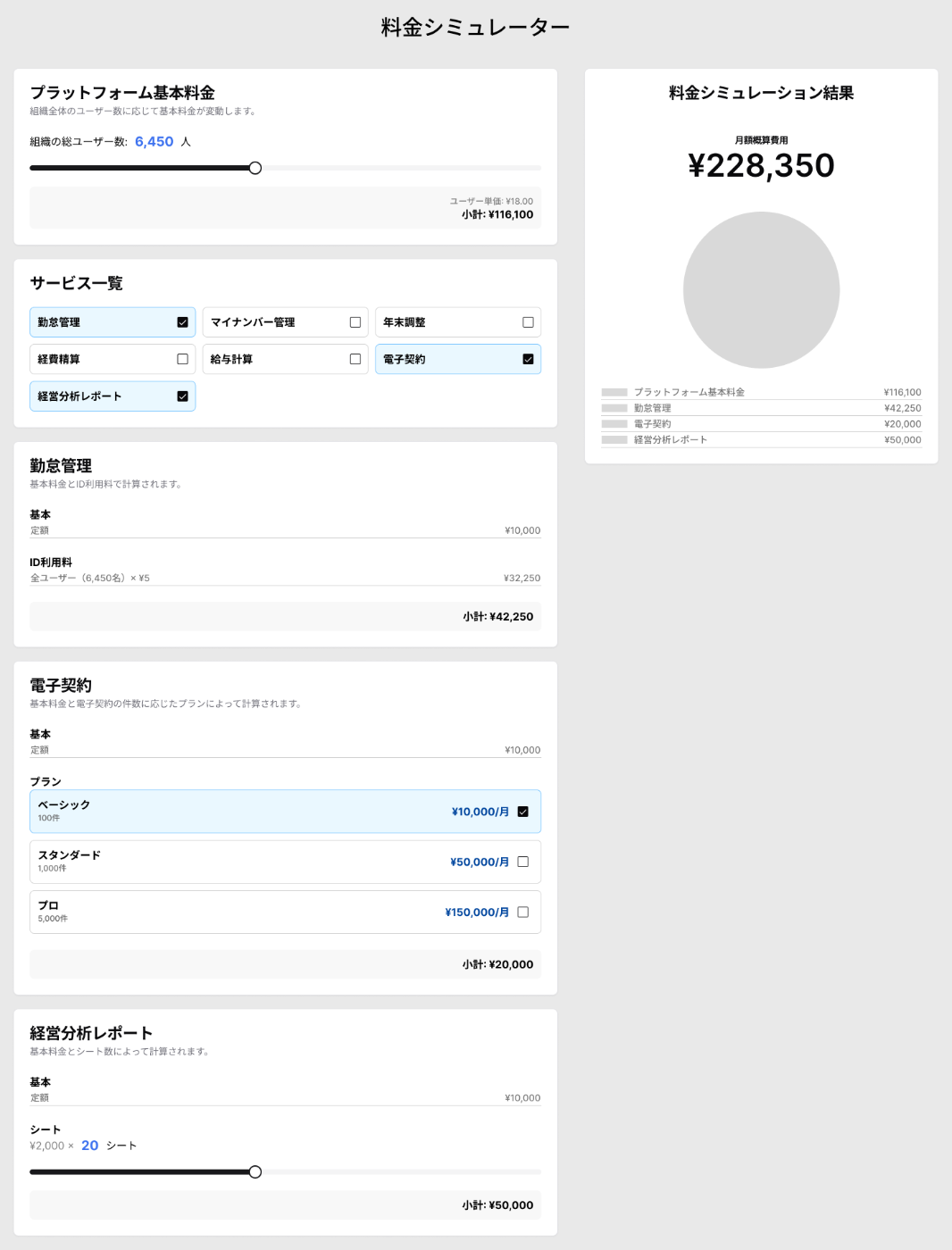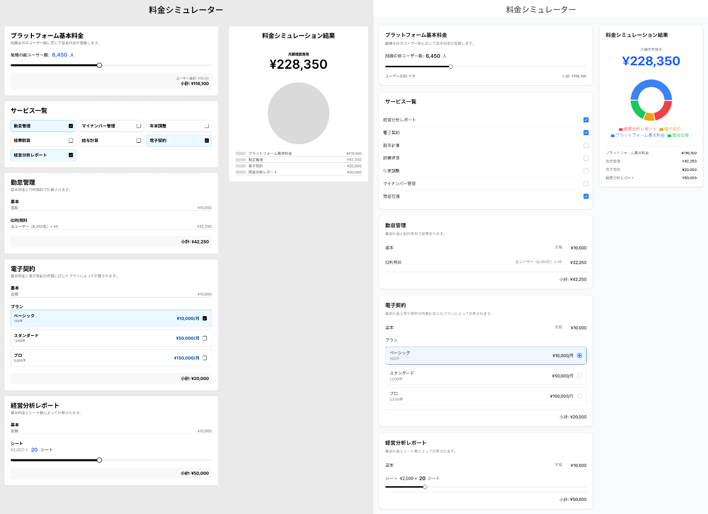 フィンテック系のサービス群を複数契約したときの、料金をシミュレーションすることができる料金シミュレーターをFigmaファイルで作ってみました。Figmaのコミュニティにある@shadcn/uiのライブラリを使えば、実装時に同じライブラリで実装できると考え選んだのですが、結果的にはこの選択が間違っていたかも・・・・・・。