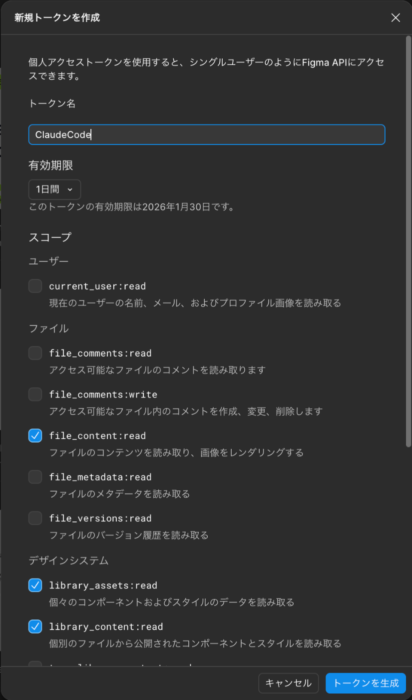 - Figmaの設定 > セキュリティから個人アクセストークンを作成