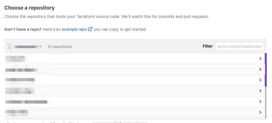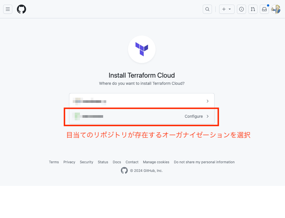 目当てのリポジトリに対してTerraform Cloudがアクセス権限を持っていないので、Terraform Cloudがアクセスできるリポジトリ一覧を更新すればOKです