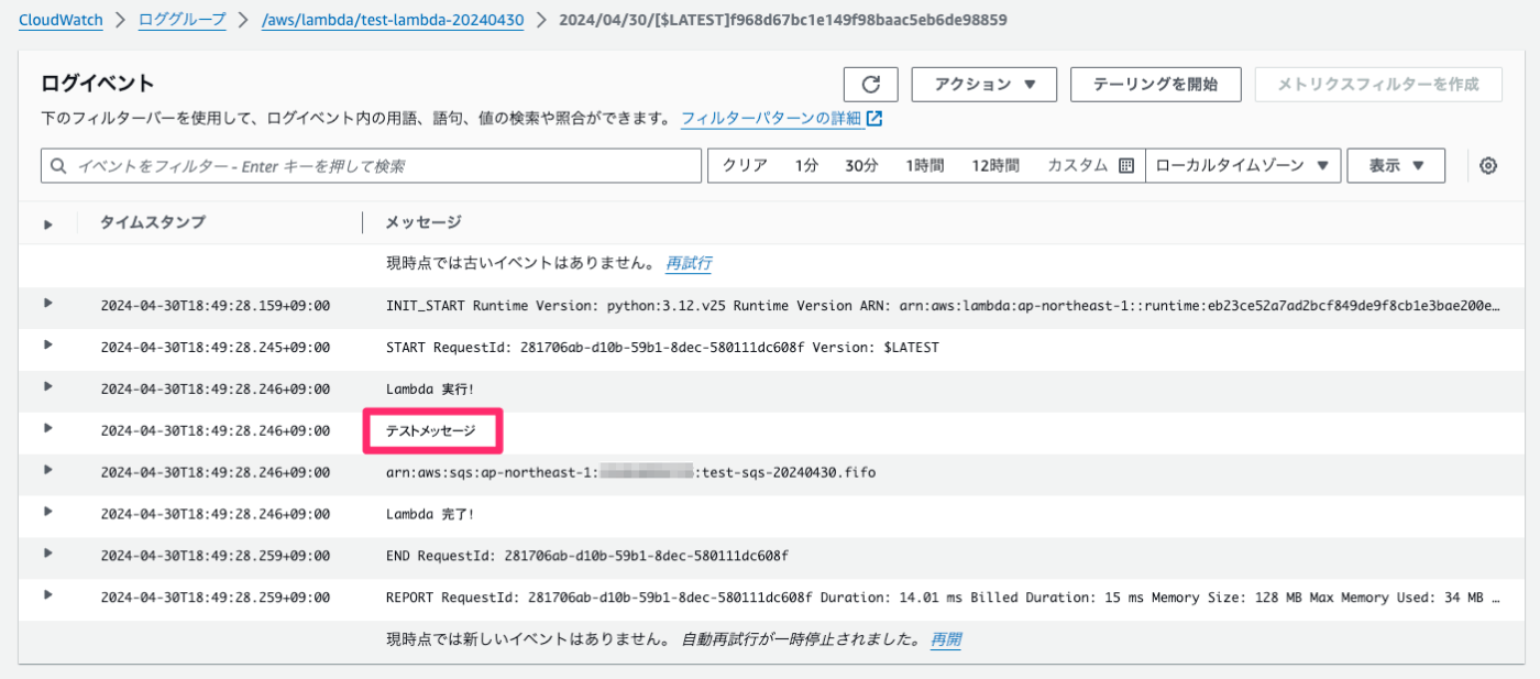 メッセージを送信すると Lambda が実行されるはずなので CloudWatch を確認してみます。