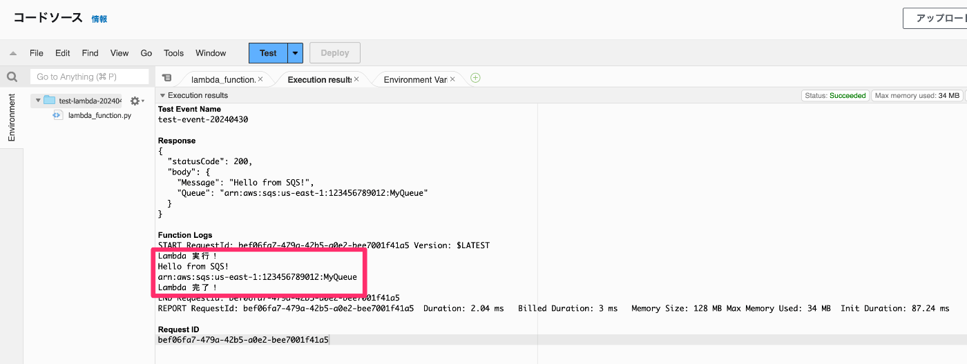以下のような SQS のテストイベントを作成して実行します。