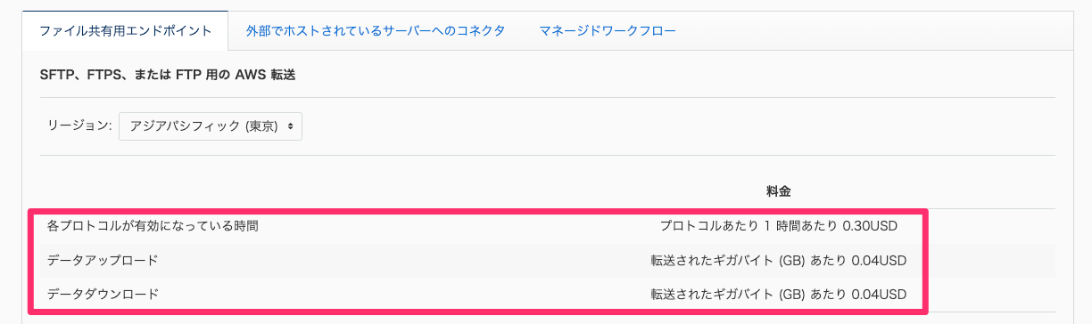 注意点! SFTP サーバは作成されているだけで以下の料金がかかってしまうので気をつけてください。