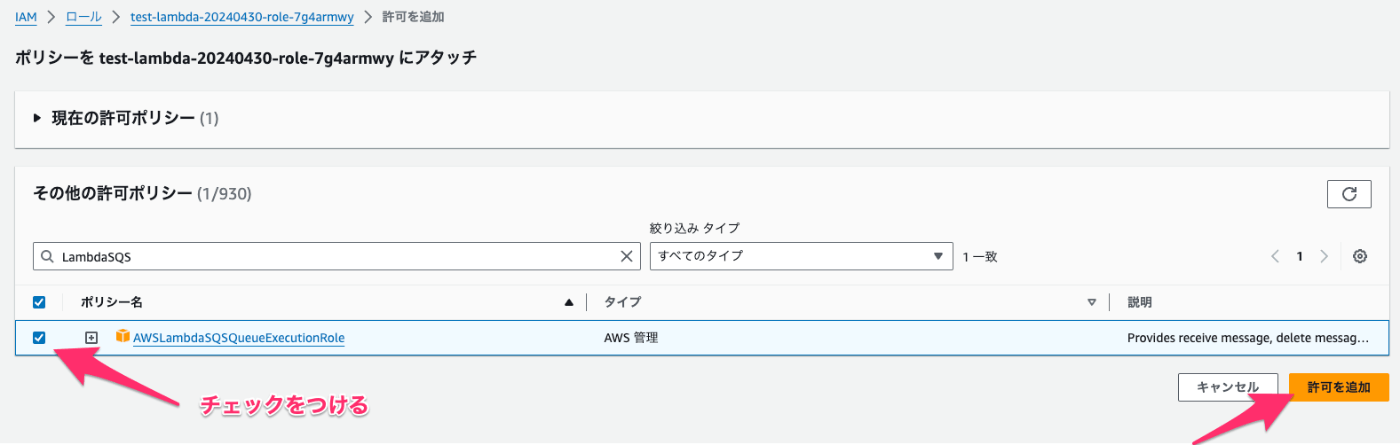 次に トリガーとして SQS を選択するのですが、その前に Lambda にアタッチされたロールにポリシーを追加します。