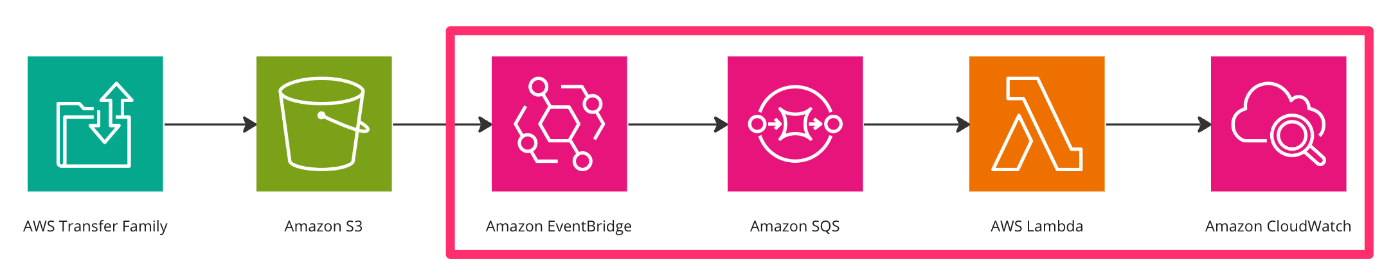 これで Transfer Family -> S3 と SQS -> Lambda ができたのでその間を EventBridge でくっつけたいと思います。