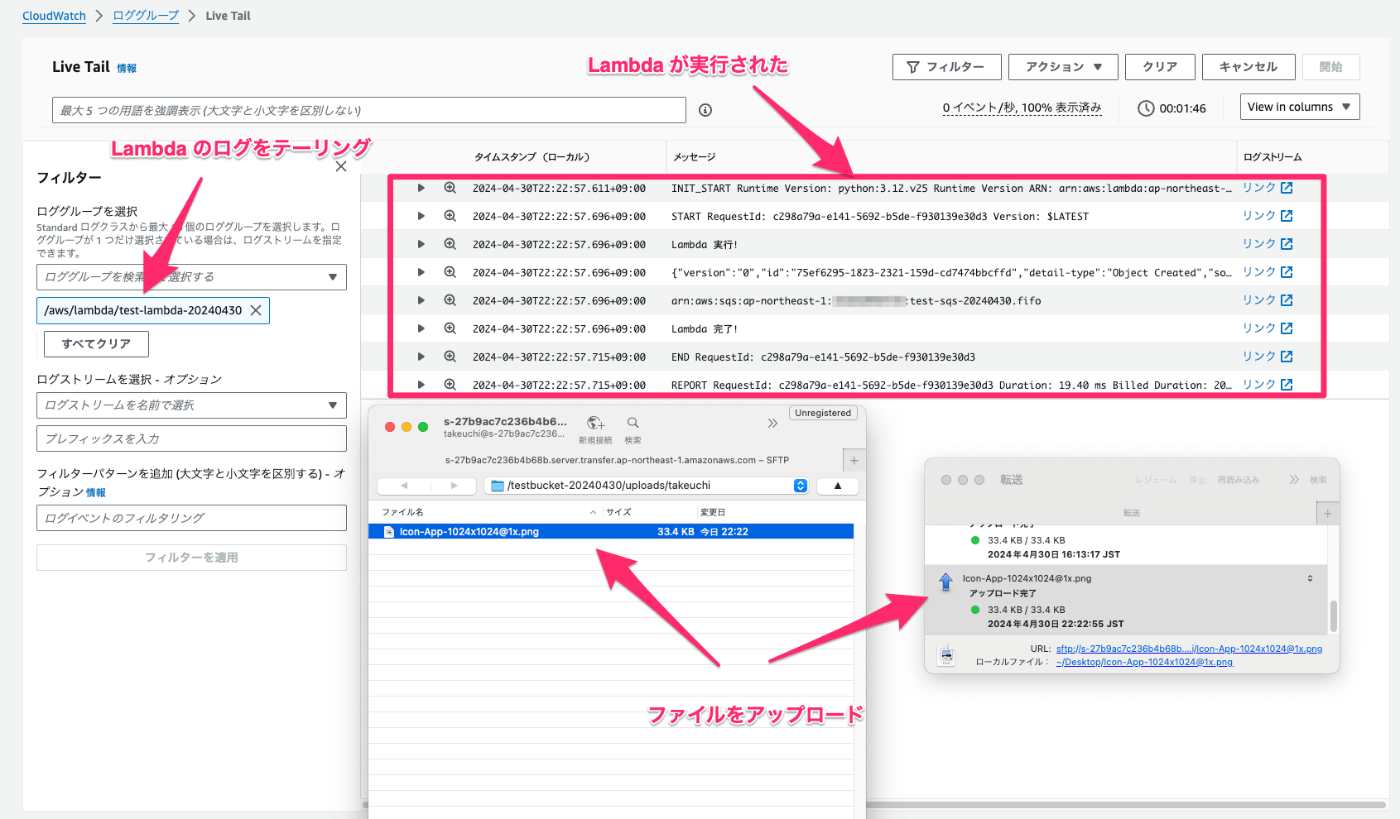これで全てが組み上がったので実際に SFTP サーバにファイルをアップして動作を確認してみます。