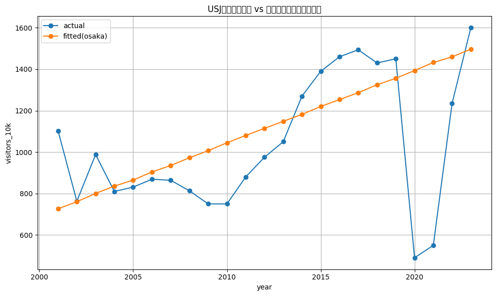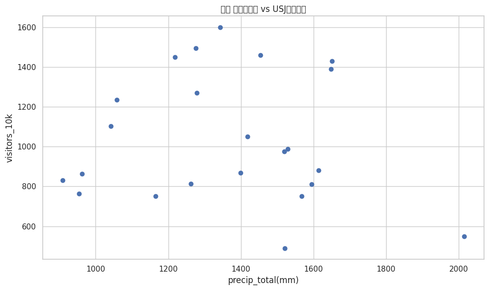 本フェーズでは、大阪の天候(降水量)とUSJの年別来場者数との関係を整理し、「天候による来場者影響の大きさ」を推定します。