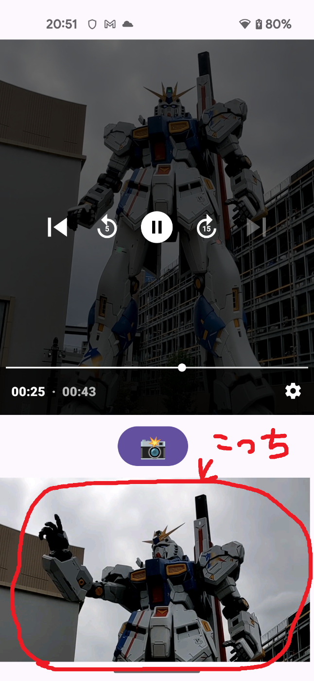 PlayerView関連のコードが、ガーっていっぱい並んでいるので見にくくなってるんだけど、サムネイル生成のためのコードは下記3行。