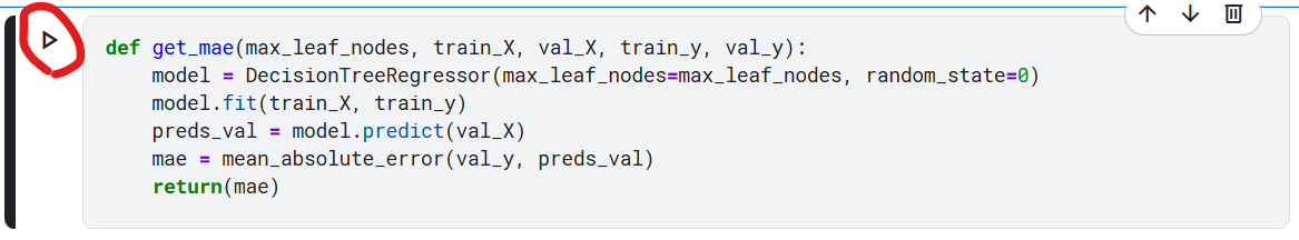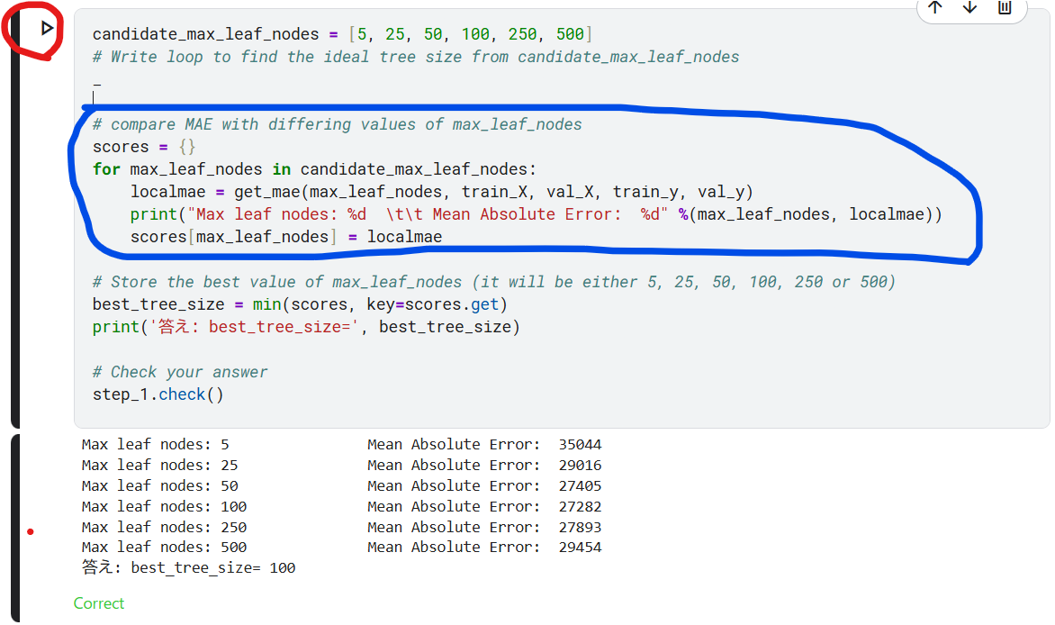 max_leaf_nodes の各値に対して get_mae 関数を呼び出します。出力は、データに対して最も正確なモデルを生成する max_leaf_nodes の値を選択できるように、何らかの方法で保存します。