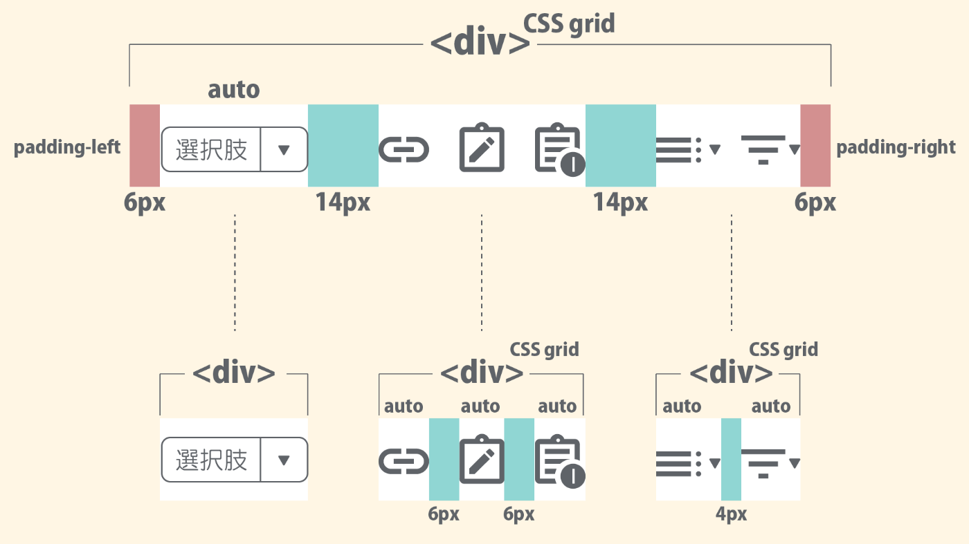 画像のようなツールバーのレイアウトを CSS grid で実現してみます。CSS grid ではcolumn-gapプロパティは grid コンテナ 1 つにつき 1 種類しか指定できないので、要素間の間隔が不均一なレイアウトはcolumn-gapでは実現できません。
