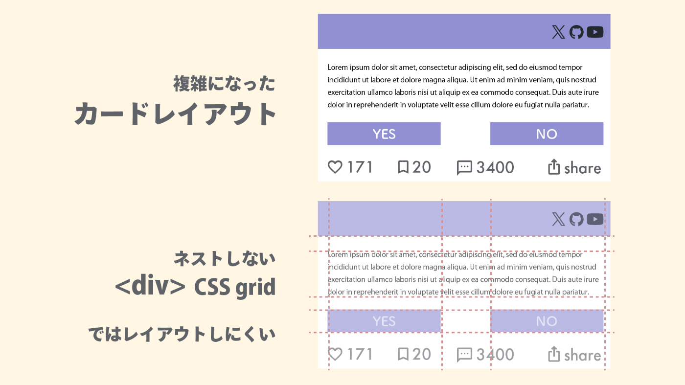 そもそも CSS grid では使わなくて良くなった「不必要にネストした<div>」とは、CSS flex で複雑なレイアウトを実現するときによく使われていたものです。それらは CSS grid 登場後に「同じレイアウトを CSS grid で実現すると、一部の<div>のネストが不要になる」という例が複数認識されることによて、CSS flex と grid の差として認識されることになりました。