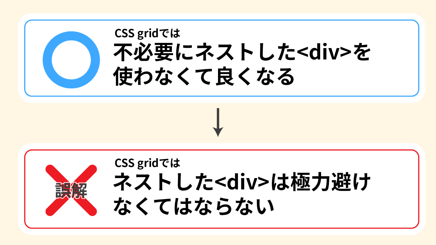 このメリット自体は正しいのですが、私の場合なぜか CSS grid の使い方を練習するうちに、いつの間にか誤解してしまい「ネストした<div>を極力避けなければならない」と思いこむようになっていました。