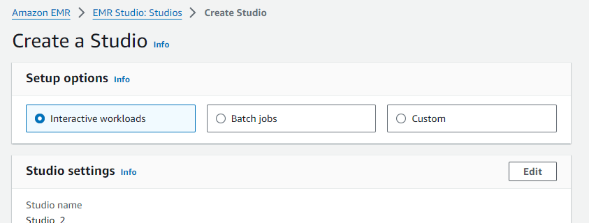 まずは インタラクティブ用の EMR Studio をデフォルト設定で作成する。