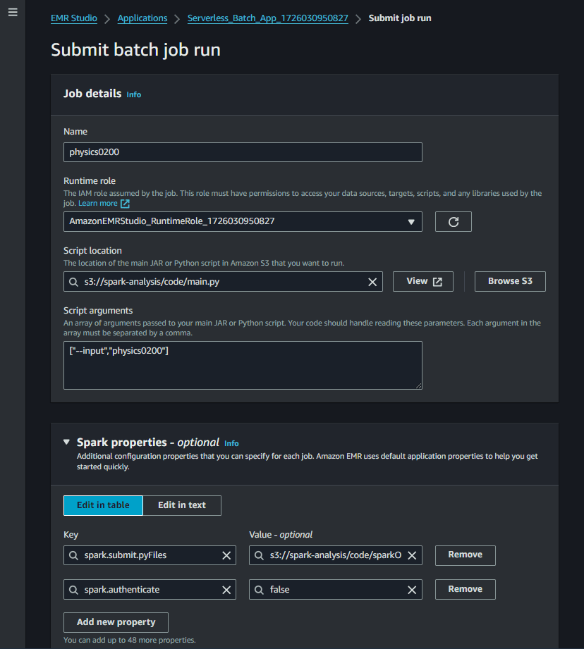 "sparkSubmitParameters": "--conf spark.submit.pyFiles=s3://spark-analysis/code/sparkOEDOModules.zip --conf spark.authenticate=false"