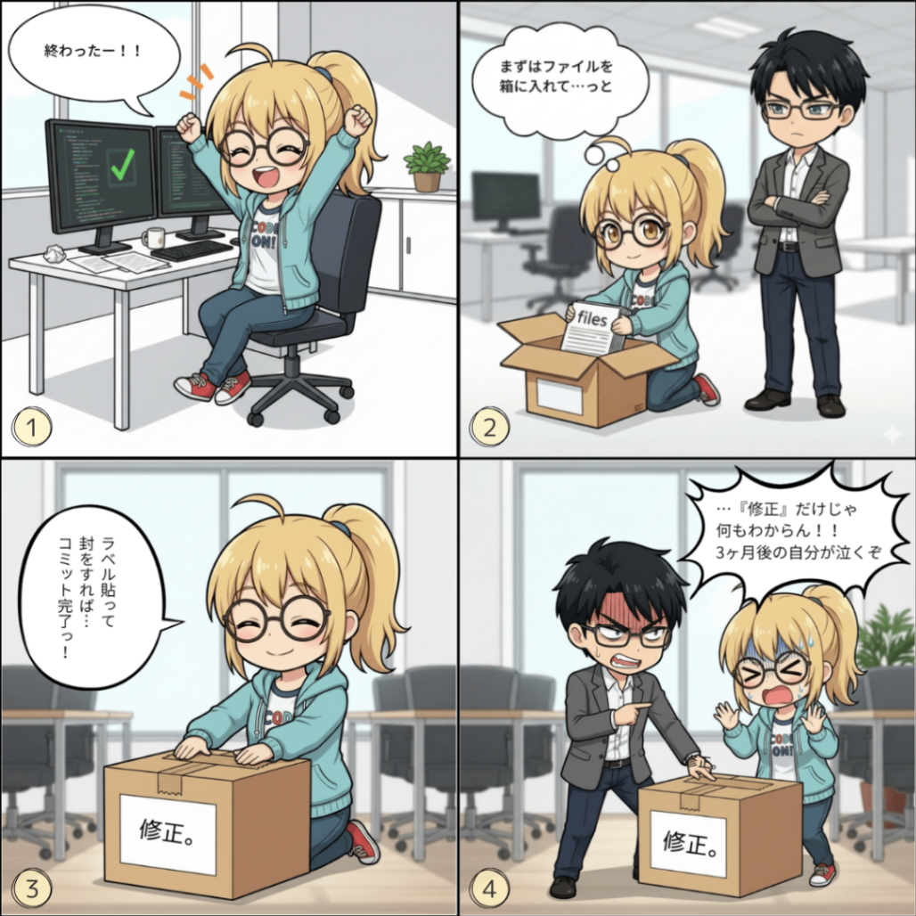 テーマは「コミットメッセージが雑」という、よくある失敗です。